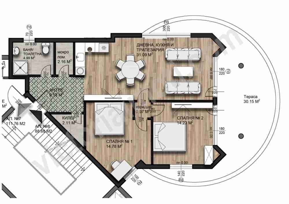 Описание: Екипът на Виктория Имоти има удоволствието да предложи едно уникално и нестандартно предложение за продажба на жилище до Велико Търново. Сградата се намира в китно селце само на 2 км от града, в новопостроена сграда, която ще се откроява от всички останали в района поради допълнителните удобства, изградени за живущите. На първо място - двор. Липсата на зелени площи е един прогресиращ проблем през последните години около жилищните блокове. Тук освен тази зелена пространственост, на разположение на живущите ще има барбекю и кът са събиране и отдих. И сега основният акцент на сградата - спа център на партерно ниво, който ще включва вътрешен басейн, масажно студио, фитнес, рецепция, фреш бар и съблекални. Живущите ще разполагат със собствен достъп до спа центъра, който ще се ползва срещу месечен абонамент, а външните посетители ще ползват друг вход, за да не нарушават спокойствието и високото ниво на сигурност в сградата. Относно самата сграда - тя в момента е на акт 14 (груб строеж), като текат довършителните дейности по нея. Материалите, които ще се вложат в нея ще бъдат безкомпромисни откъм качество, а именно - алуминиева дограма с троен стъклопакет, прекъснат термомост, цвят - антрацит. Общите части ще се изпълнят с гранит и мрамор, а фасадата ще се завърши с външна изолация 12 см EPS - черна серия на Austroterm и Baumit. Въпреки ниската етажност, сградата ще разполага със асансьор.